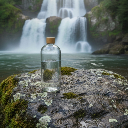 La bouteille est fabriquée à partir de PET recyclé, complété par des éléments en hêtre et en aluminium, ce qui contribue à limiter l’utilisation de matières vierges et s’inscrit dans une démarche plus respectueuse de l’environnement.