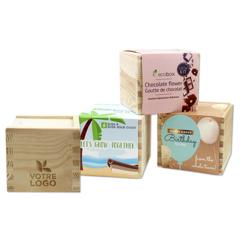 L'Ecobox durable est un article DIY (cadeau) d'une longévité particulièrement grande que l'on peut offrir ou garder soi-même. La boîte en bois « Grow it yourself » est fabriquée en bois de pin de haute qualité et contient un pot de culture biodégradable, des pastilles de fibres de noix de coco qu'il faut arroser, un bâtonnet de culture en bois pour faire une inscription (p.ex. la date de la culture et/ou la sorte de plante) ainsi qu'un petit sachet de semences de plantes.