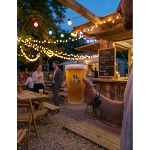 La pinte de bière réutilisable et personnalisable est le format idéal pour les amateurs de grandes boissons et les événements conviviaux. Avec une contenance utile de 50 cl et une capacité maximale de 60 cl à ras bord, elle offre une marge confortable pour le service, garantissant une expérience agréable sans débordement.