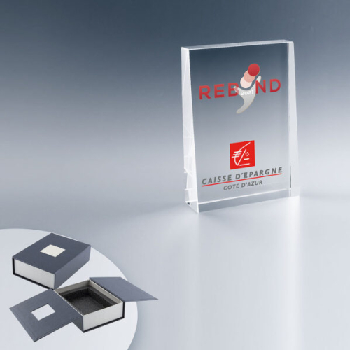 Alliant l’élégance du verre à des technologies de pointe… La gravure laser et/ou l’impression couleur, ce trophée cristallin permet de réaliser des créations uniques.